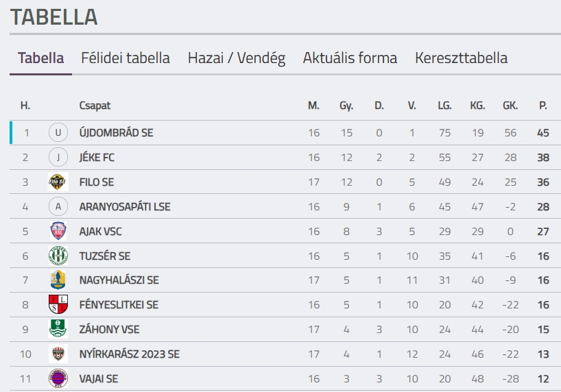 A FILO SE ezzel 36 pontos, míg az Újdombrád (45 pont) veresége ellenére is kényelmesen, hét ponttal vezeti a tabellát.
