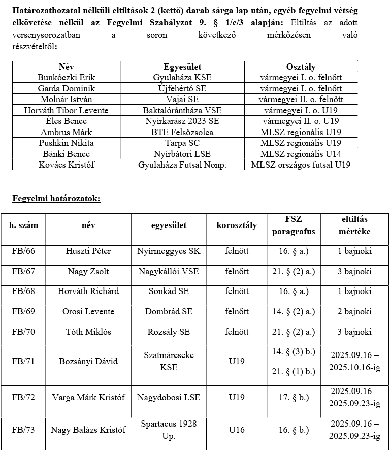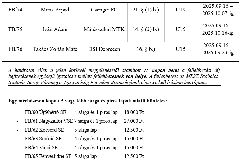 40/VB: a létszámcsökkenést követően félbeszakadt Kálmánháza SE – Bököny SE vármegyei III. osztályú bajnoki mérkőzést a VB a pályán elért eredménnyel (5:0) hagyja jóvá. A vétkes Bököny SE csapatát írásbeli figyelmeztetésben részesíti, valamint fegyelmi eljárást kezdeményez ellene.