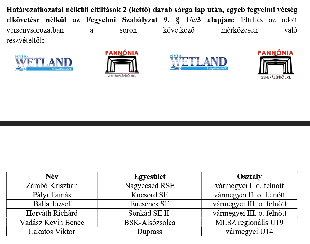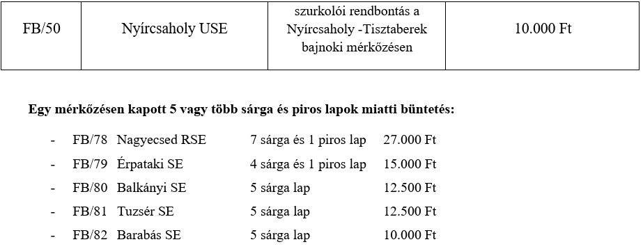 59/VB: a Csenger Petőfi DSZSE U14-es csapatának első alkalommal történő ki nem állása a Fehérgyarmati DFSZSE – Csenger Petőfi DSZSE bajnoki mérkőzésen. A VB a mérkőzés három pontját 3:0 gólkülönbséggel a vétlen Fehérgyarmati DFSZSE csapat javára igazolja. Írásbeli figyelmeztetésben részesíti a Csenger Petőfi DSZSE csapatát.