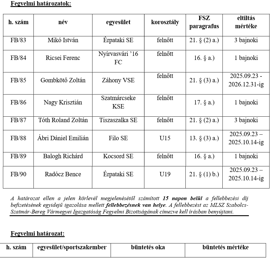 58/VB: a Gyulaháza KSE U14-es csapatának első alkalommal történő ki nem állása a Mándok VSE – Gyulaháza KSE bajnoki mérkőzésen. A VB a mérkőzés három pontját 3:0 gólkülönbséggel a vétlen Mándok VSE csapat javára igazolja. Írásbeli figyelmeztetésben részesíti a Gyulaháza KSE csapatát.