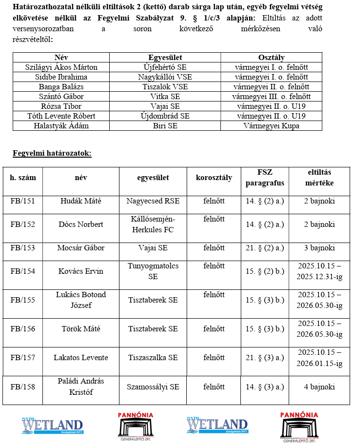75/VB: a Balkányi SE – Rakamazi Spartacus SE U19-es bajnoki mérkőzésen történt jogosulatlan játékos szerepeltetése miatt a VB a Rakamazi Spartacus SE csapatától 1 (egy) büntetőpont levonását rendeli el.