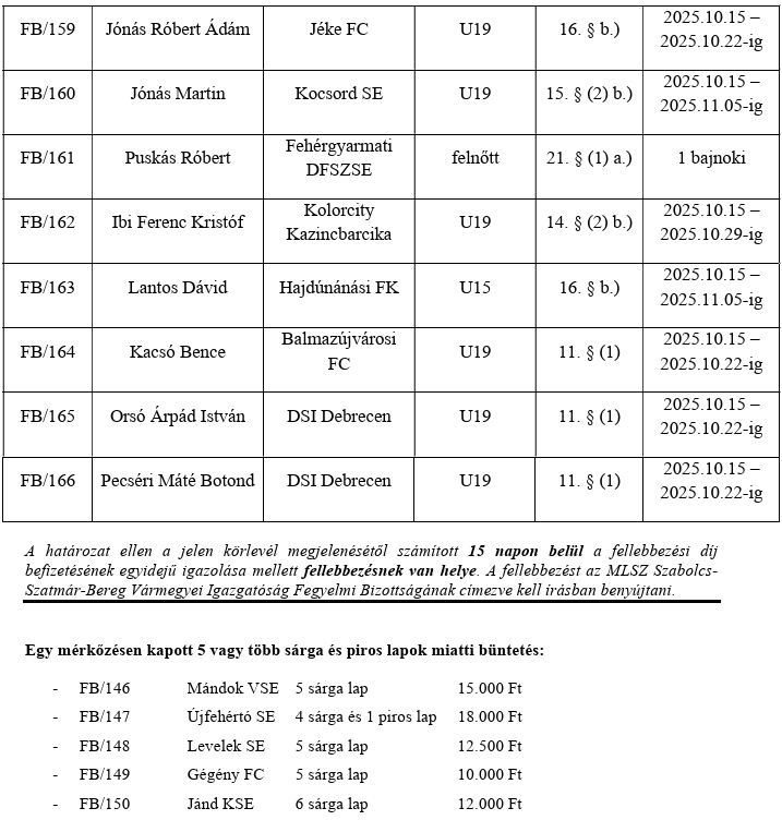 82/VB: a B-Kerép Nyírbátor U14-es csapatának második alkalommal történő létszámhiányos kiállása, a DSI Debrecen – B-Kerép Nyírbátor MLSZ Regionális U14-es bajnoki mérkőzésen. A VB 1 (egy) büntetőpont levonását rendeli el a B-Kerép Nyírbátor U14-es csapatától.