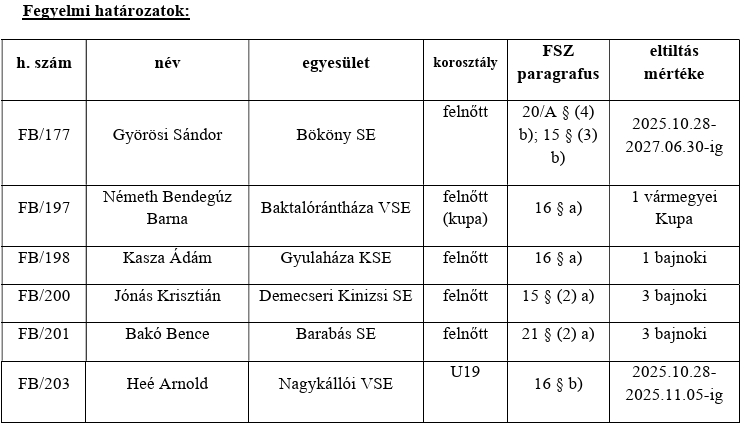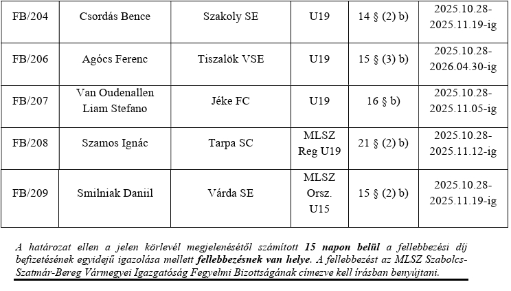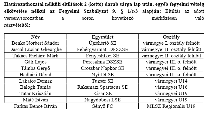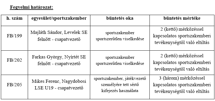 94/VB: a Csenger FC U19-es csapatának első alkalommal történő ki nem állása, a Cigánd SE – Csenger FC regionális bajnoki mérkőzésen. A mérkőzés 3 bajnoki pontját, 3:0-s gólkülönbséggel a vétlen Cigánd SE javára igazolja. Írásbeli figyelmeztetésben részesíti a Csenger FC csapatát.