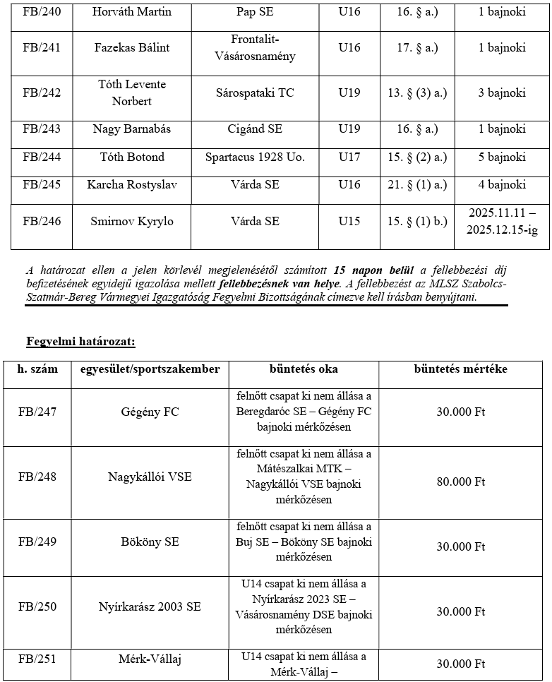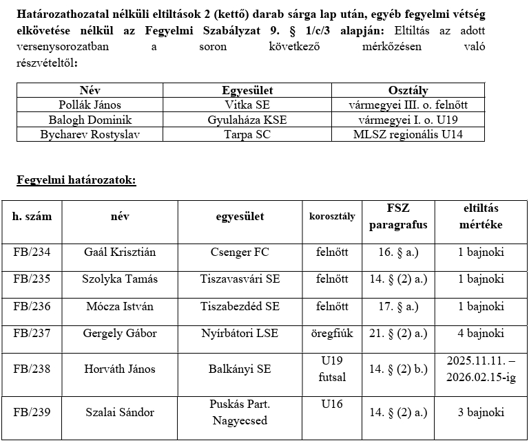 106/VB: az Apagy SE U13-as csapatának első alkalommal történő ki nem állása, november 04i vármegyei tornán. Írásbeli figyelmeztetésben részesíti az Apagy SE csapatát.