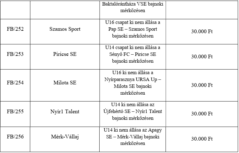 105/VB: a Tiszadob SE felnőtt csapatának első alkalommal történő ki nem állása, a Buj SE – Tiszadob SE vármegyei bajnoki mérkőzésen. A mérkőzés 3 bajnoki pontját, 3:0-s gólkülönbséggel a vétlen Buj SE javára igazolja. Írásbeli figyelmeztetésben részesíti a Tiszadob SE csapatát, egyben fegyelmi eljárást kezdeményez ellene.