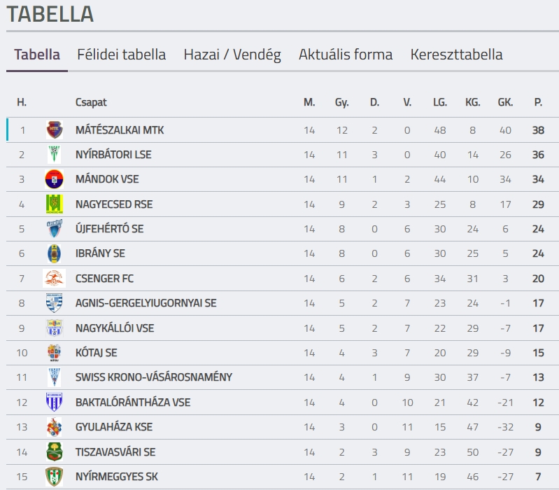A tabella alján a Nyírmeggyes áll. Mindössze 2 győzelem és 11 vereség, valamint a -27-es gólkülönbség jelzi a mély válságot. A csapatnak óriási bravúrra és radikális formajavulásra lesz szüksége tavasszal, hogy elkerülje a kiesést. Az egyetlen reménysugár, hogy a 13-14. helyezettek (Gyulaháza, Tiszavasvári) látótávolságon belül vannak.