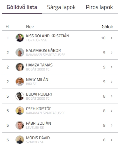 A korábban a múltjuk alapján esélyesnek tartott támadók, Budai Róbert (Bogát 2000 TC) és Módis Dávid (Szakoly SE) szintén az élmezőnyben vannak, 8-8 góllal az 5. helyen állnak, bizonyítva, hogy továbbra is számolni kell velük. Fábri Zoltán (Levelek SE) és Cseh Kristóf (Rakamaz) és Scheibli Máté (Nyírvasvári) szintén 8 góllal vették ki a részüket a gólgyártásból.